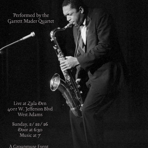 The Garrett Mader quartet is currently performing the music of John Coltrane with a fiery set that takes the audience through every stage of his career. The concert starts with Coltrane's earlier, bop-adjacent arrangements and goes through to this explosive, spiritual late career.
